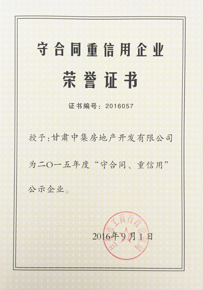 2016年9月1日,由蘭州市工商行政管理局評選的蘭州市2015年度“守合同重信用公示企業(yè)”對社會各界發(fā)布,本次全蘭州市共發(fā)布88個“守合同重信用公示企業(yè)”。甘肅中集實業(yè)集團(tuán)有限公司子公司甘肅中集房地產(chǎn)開發(fā)有限公司憑借“重誠信、謀發(fā)展”的經(jīng)營發(fā)展模式,喜獲蘭州市2015年度“守合同重信用公示企業(yè)”榮譽稱號,為甘肅中集集團(tuán)發(fā)展里程再添輝煌。